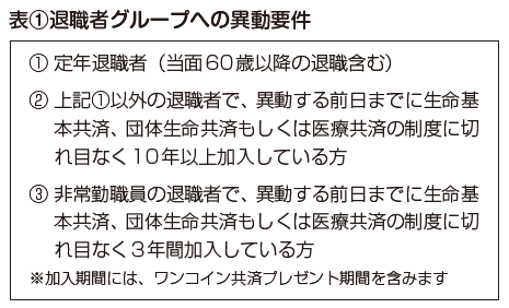 あります。退職者グループへの異動要件は表①をご覧ください。定年年齢前に60歳以降で退職される方についても、定年退職者と同じように退職者グループへ異動できます。