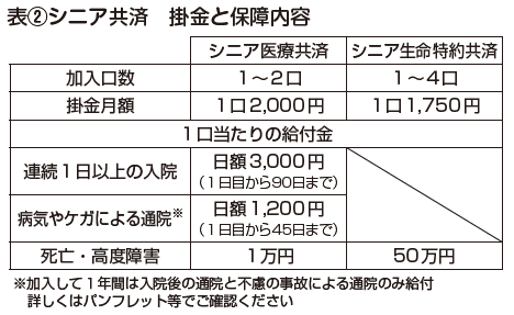 60歳以上のOB組合員のための制度です。ケガや病気で通院や入院した場合に給付が受けられます(表②)。65歳までに加入すれば80歳まで継続できます。