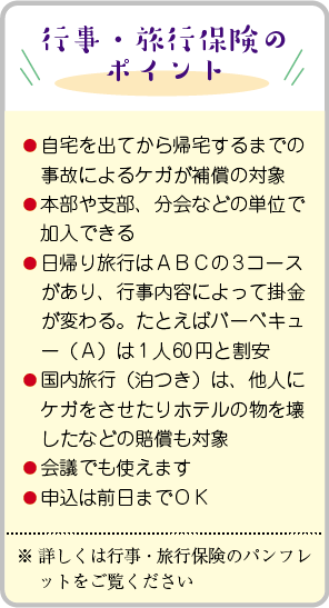 国公共済会の行事・旅行保険が再スタートしました。組合の行事を安心して開催するために、行事・旅行保険を大いに活用してください。