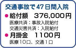 ◆エレベーター、エスカレーターに乗っているときの不慮の事故も交通災害に含みます。また、交通事故で入院した場合、加入している該当する全ての制度(生命・医療・交通災害共済)から給付されます。